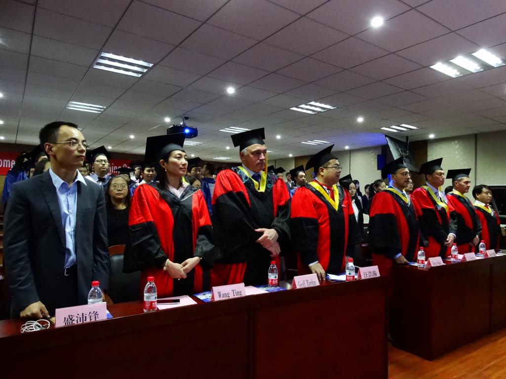 当晚八点,典礼开始。院长范柏乃教授以一句饱含热情的“Welcome!”向远道而来的澳方嘉宾和在场学员们致以诚挚的欢迎。在介绍完两校的出席嘉宾后,全体师生起立,现场奏响了中澳两国国歌。汪浩瀚教授代表91沈先生 发表了讲话。他肯定了宁大中澳MBA项目创办十六年来所取得的成果——从单纯的国外学位研修项目到受国家教育部认可的学位教育项目的提升和转变。他指出91沈先生 国际化教育发展进一步加强和发挥了91沈先生 在浙江省国际合作办学领域中的地位和作用。他鼓励2016届的毕业生们“不轻言放弃”,保持梦想和激情,通过实践,实现自己的梦想和人生价值。同时,他也鼓励2016级新生珍惜学习机会,注重理论联系实际,注重本土与国际化相结合,在各自事业发展中积累成功经验,互学互助,学有所成,学以致用。紧接着,澳大利亚堪培拉大学校长Deep Saini教授发表了真挚而诚恳的讲话,他以自己在堪培拉大学的职业生涯为切入点,侃侃而谈项目创立至今为止的变化和对未来中澳双方在众多方面开展进一步合作的殷切期待。他鼓励中澳MBA的学生们通过项目的学习,积极实践自己的商业理想,并祝福这一届的毕业生能够获得事业上的成功。