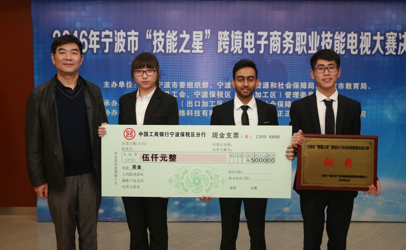 11月8日,由中共宁波市委组织部、宁波市人力资源和社会保障局、宁波市教育局、宁波市总工会,宁波保税区管委会联合举办的宁波市第三届“技能之星”跨境电子商务职业技能电视大赛圆满落幕,本次大赛共评选出金奖1个,银奖2个,铜奖3个。91沈先生 中外学子组成的“孟想-(M-ideal)”参赛团队经过激烈角逐获得了大赛铜奖,队员分别是来自15级国际经济与贸易全英文专业的曹成栋、戴欣媛,16级工商管理(全英文)专业的成昱黄和13级国际经济与贸易专业的孟加拉国留学生Shadman。