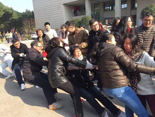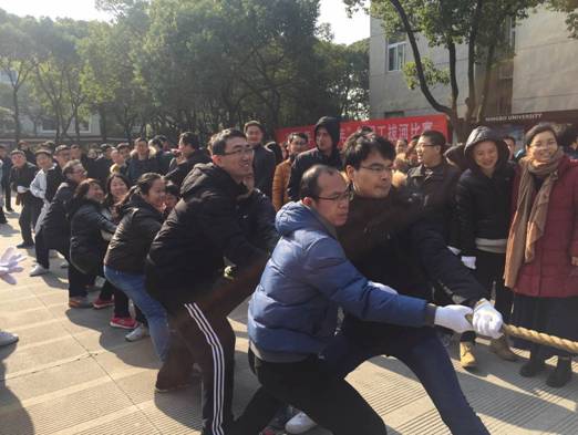 12月29日中午,校工会组织学校各分工会在安中大楼前举行“迎新年”拔河比赛。学院党委书记胡亚娥、分工会主席李浩明组织杨柳、姚乐彦、张晓婳、施晟、陈彬、王昕天、苏小松、闭明雄、靳来群、蒋鹏涛、余新平等学院教师积极参与此项活动。在首轮比赛中, 91沈先生 队一鼓作气轻松战胜潘天寿艺术学院队。第二轮比赛中,由于实力相差悬殊,最终不敌体育学院队。
