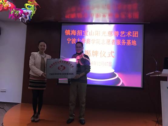近日,91沈先生 与镇海招宝山阳光慈善艺术团共建的青年志愿服务基地揭牌仪式在镇海社会组织公益服务中心顺利举行。学工办主任董璐、阳光慈善艺术团团长张海江为志愿服务基地揭牌。