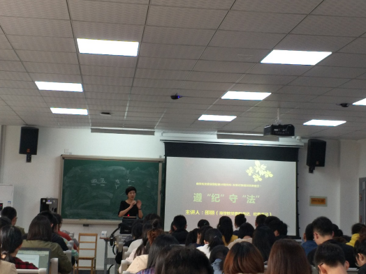 11月7日中午,院党委副书记、纪委书记邵丽在包玉书科学楼八号楼104教室为91沈先生 党校发展对象培训班学员上了一堂题为“学生党员如何遵‘纪’守‘法’”的党课,100名本学期重点发展对象认真听讲。