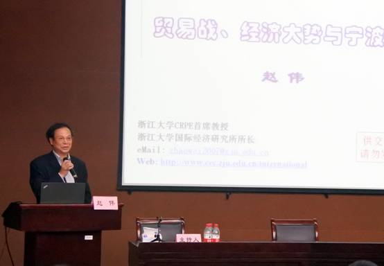 浙江大学赵伟教授以中美贸易战的热点着手,做了题为《贸易战、经济大势与宁波选择》的报告,赵伟教授图文并茂,多维度解读了当下的经济形势、中美贸易战的现状,并阐述了我们应该如何做,宁波才能顺应经济发展大势,加快宁波经济发展;赵伟教授认为,中美贸易战的战场正在逐渐扩大,负效应正在逐渐显现;赵伟教授对目前的经济大势进行了四个判断:首先,“新常态”继续加码,GDP增速继续下滑;其次,中等收入风险和金融风险发生的概率依然很高;再次,贸易战及特朗普组合拳加剧了上述风险;最后,我们国家对于重启改革,加大开放力度势在必行。而宁波作为沿海最为开放的城市,贸易战对宁波的负面影响大于一般城市。我们必须进行反思,反思以往的路径,找出宁波增长的活力之源。