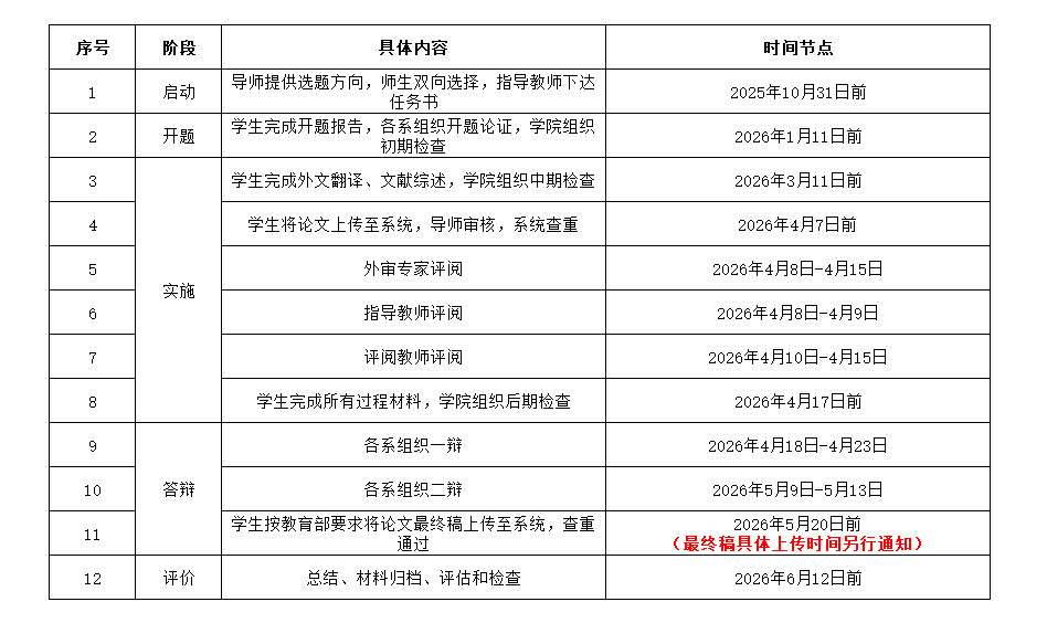 (十)根据学校要求,2026年5月20日前按教育部要求做好2026届毕业设计(论文)最终版上传工作,6月12日前完成全部归档材料。学院毕业论文的督导检查、查重情况、外审评价均纳入学院年度考核相关项目的评分依据。