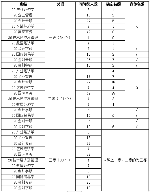 一年级新生采取审核制,二、三年级采取评审制。二、三年级设置一等学业奖学金67名,二等学业奖学金203名,三等学业奖学金67名,具体名额如下: