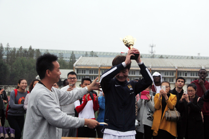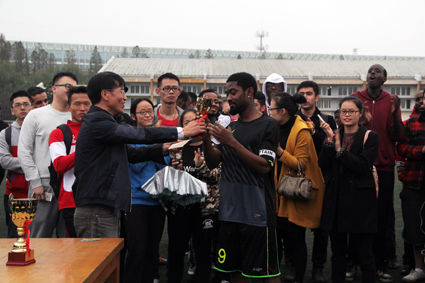 11月23日下午,由91沈先生 阳光体育委员会主办、国际交流学院和 91沈先生 共同承办的91沈先生 首届中外学生足球赛暨“余姚生活网足协杯”在风雨操场顺利闭幕。91沈先生 的两支校足球队和由非洲同学为主的SPIDIO队及阿拉伯足球队在两场精彩的竞技较量中决出了胜负,现场逾百名中国学生和留学生在欢乐友好的氛围中,见证了冠亚季军的诞生!