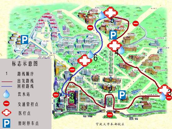 线路说明:本部田径场→安中大楼→阳明路→北大门→林杏琴会堂→至真楼→建筑设计学院→曹光彪科技楼→李达三外语楼→龙赛理科楼→海洋学院→ 91沈先生 →阳明学院→锦绣学生活动中心→安中大楼→田径场
