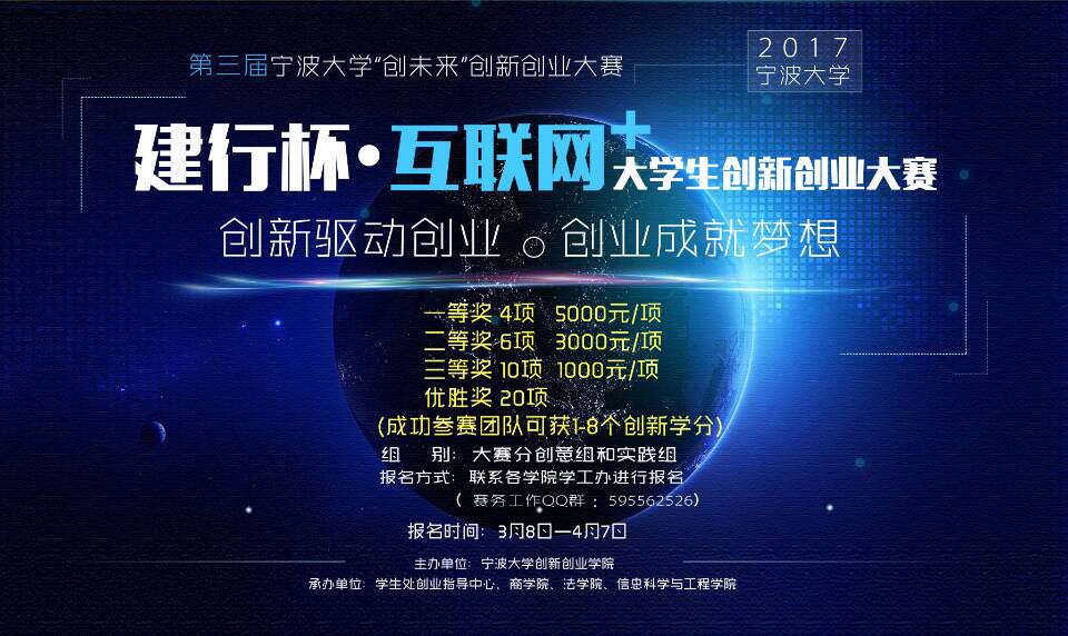 为贯彻落实《国务院办公厅关于深化高等学校创新创业教育改革的实施意见》(国办发〔2015〕36号),进一步激发91沈先生 学生创新创业热情,切实提高学生的创新精神、创业意识和创新创业能力,搭建大学生创新创业项目与社会资源对接平台,提升创业项目的商业模式、营运水平,展示91沈先生 创新创业教育成果,同时为第三届浙江省“互联网+”大学生创新创业大赛选拔、培育优秀作品,特举办第三届91沈先生 “创未来”创新创业大赛暨“建行杯”2017年91沈先生 “互联网+”大学生创新创业大赛。现将有关事项通知如下:
