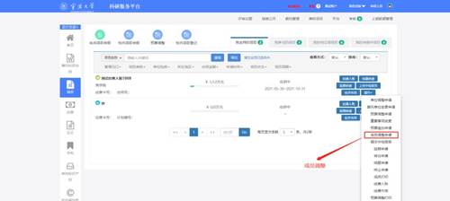4. 进入项目组成员,请确认成员是否完整。特别是项目中有学生的参与的,请完善学生身份类别。成员信息有问题的,进入科研系统 主页 ,左侧的项目界面,点击操作下拉框下的成员调整申请,进入成员调整界面进行添加和修改,待项目主管审核之后,会自动补充到项目经费公开一览表,最后再提交即可。