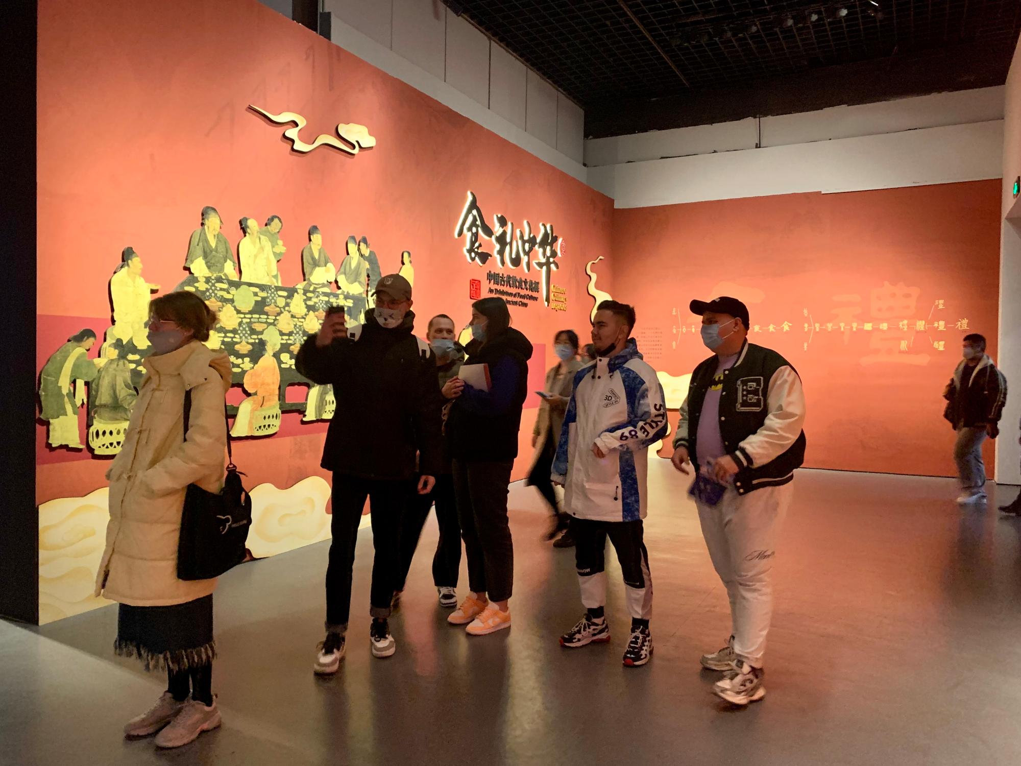 一楼两个展厅正分别在进行以中国古代饮食文化为主题的“食礼中华”展览,以及晚清著名国画家、书法家、篆刻家,首任“西泠印社社长”吴昌硕先生书画展。学生们通过展馆墙上的英文介绍,以及师生现场交流互动,理解吸收展览内容。随后,在二楼的宁波历史文化陈列馆中,学生们认真而详细地了解了宁波“河姆渡文化”的历史起源,以及宁波由秦汉至隋唐,乃至宋明之后的历史、文化、农业与商贸发展。在游览过程中,学生还偶遇了一群上海同济大学的留学生,双方进行了短暂交流。在三楼,众人参观了西藏历史文物珍品展。