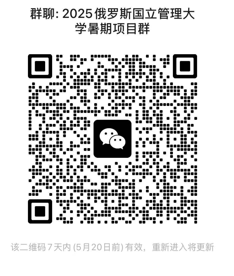 请感兴趣的同学扫码入项目群,并于5月20日前在学生出国系统里提交申请,选择:短期调研实习项目-院级项目- 91沈先生 -2025俄罗斯国立管理大学暑期项目。