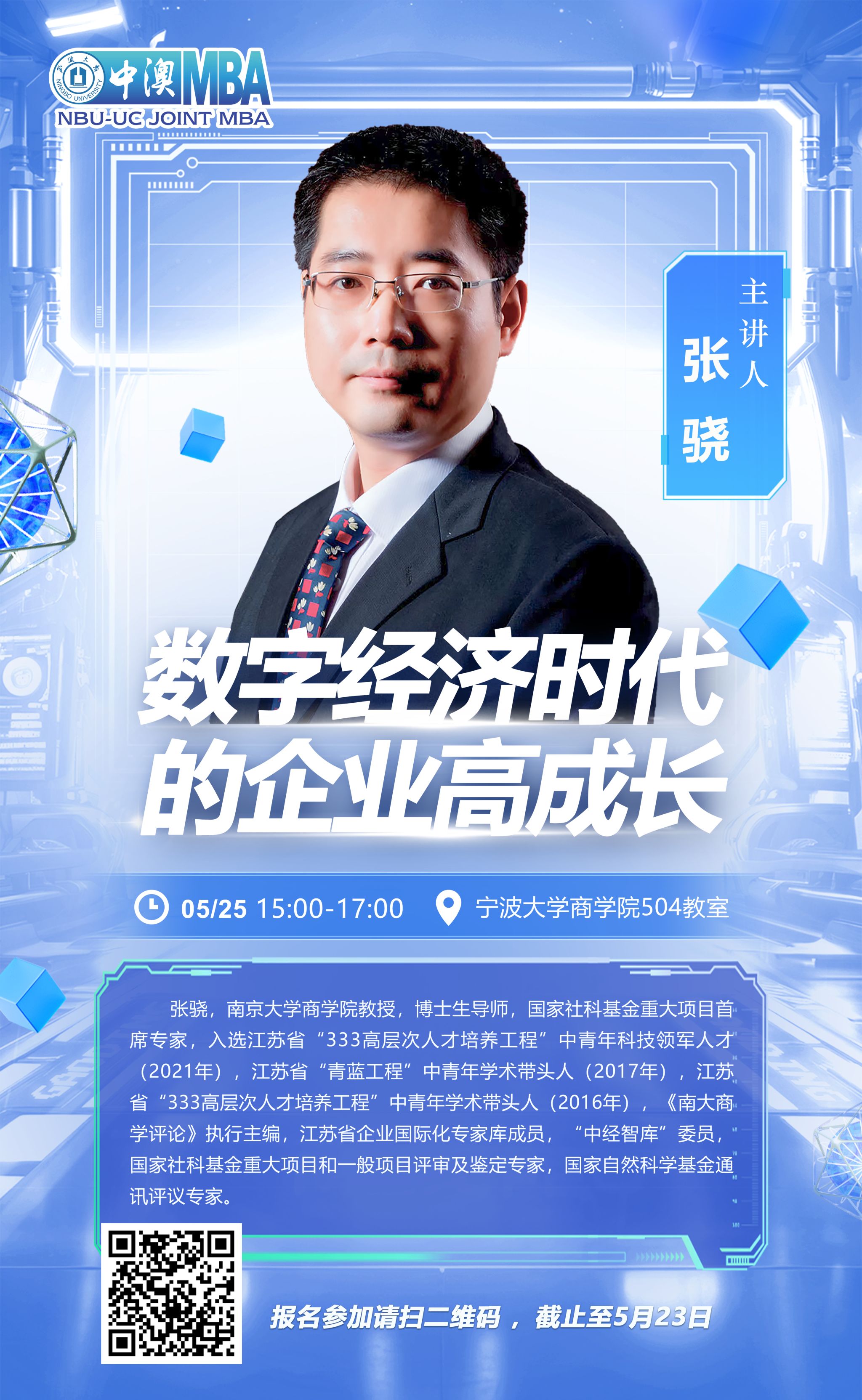 为进一步提升中澳MBA项目教学育人质量,促进校友与学校的交流互动,中澳MBA项目特邀请南京大学 91沈先生 张骁教授来院进行题为《数字经济时代的企业高成长》的讲座。欢迎广大师生校友积极参加!