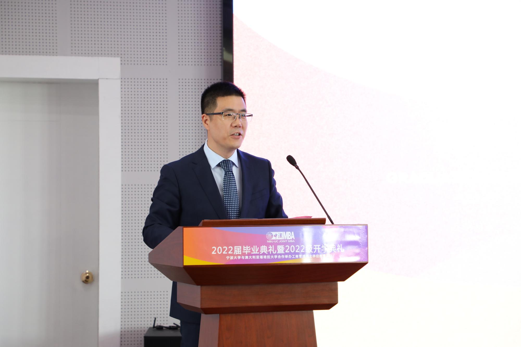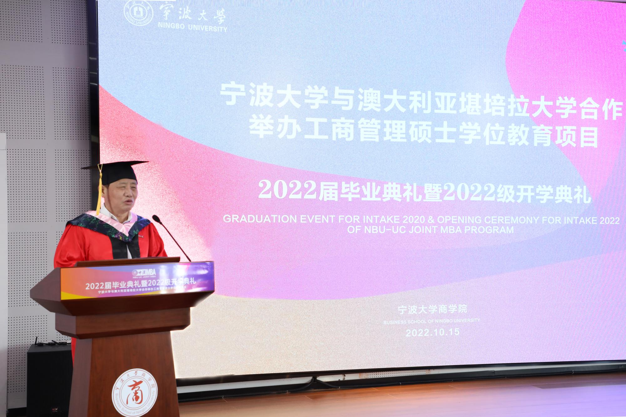 在澳大利亚堪培拉大学的毕业典礼现场视频播放后,金院长首先致辞。他祝贺同学们顺利完成学业,感谢老师们的辛勤付出,也感谢社会各界对91沈先生 中澳MBA发展的支持。他指出中澳MBA项目应该及时顺应社会发展变化趋势,定位高质量发展培养体系,培养更多“有创新思维,懂资本运营”的人才;同时,他还提出“大学MBA”教育应通过学生自主“批判式”学习,敢于挑战教科书中的权威理论观点,增加同任课教师的课堂互动,“敢问问题”、“会问问题”,来有效提升课堂的教学质量,增加学习的探索性和研究性;第三点,他提出项目要进一步提高游学活动质量。“读万卷书,行万里路”。培养学者和有思想的人,“行万里路”是非常重要的。金院长通过分享他暑期的游学经历,倡导MBA学员们要不断丰富自身的思想体系,训练悟性,激发灵感,为明天步向成功做好准备。
